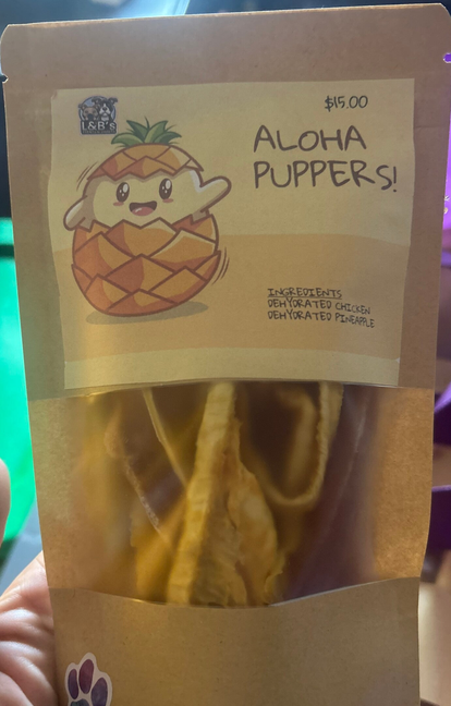 Our very own dehydrated chicken and pineapples. Freshly cut, trimmed and dehydrated for any dog to wnjoy